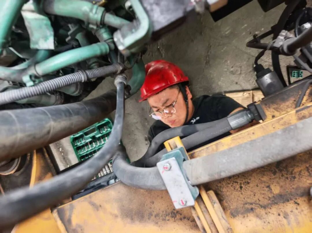 某客户一台正面吊突发臂架伸缩油缸漏油故障,西部陆海服务工程师方炫驭接到任务后,立即驱车两百多公里,跨越地域、奔赴现场,最终及时排除故障。