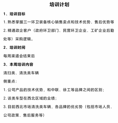 培训于每周渠道会结束后开展,本周聚焦清扫类、清洗类车辆,重点拆解三大板块:1.对比分析好体育综合app下载产品与中联、徐工等品牌的技术差异,让团队能精准讲出“人无我有、人有我优”的核心竞争力;2.复盘该类车型在西北区域的过往业绩,提炼市场拓展的成功经验;3.梳理西北市场清洗类车辆各品牌的优劣势,从市场人员、公司政策、售后服务等维度为团队提供“作战地图”。以学促战,赋能市场“懂产品、懂客户、懂市场,才能更好地服务客户。”西北大区李总表示,后续培训还将持续覆盖更多产品品类与客户场景,通过“学练结合”让每一位成员都成为能打硬仗的“环卫装备专家”,为西北区域客户提供更专业的服务,助力好体育综合app下载环卫在西北市场再创新佳绩。