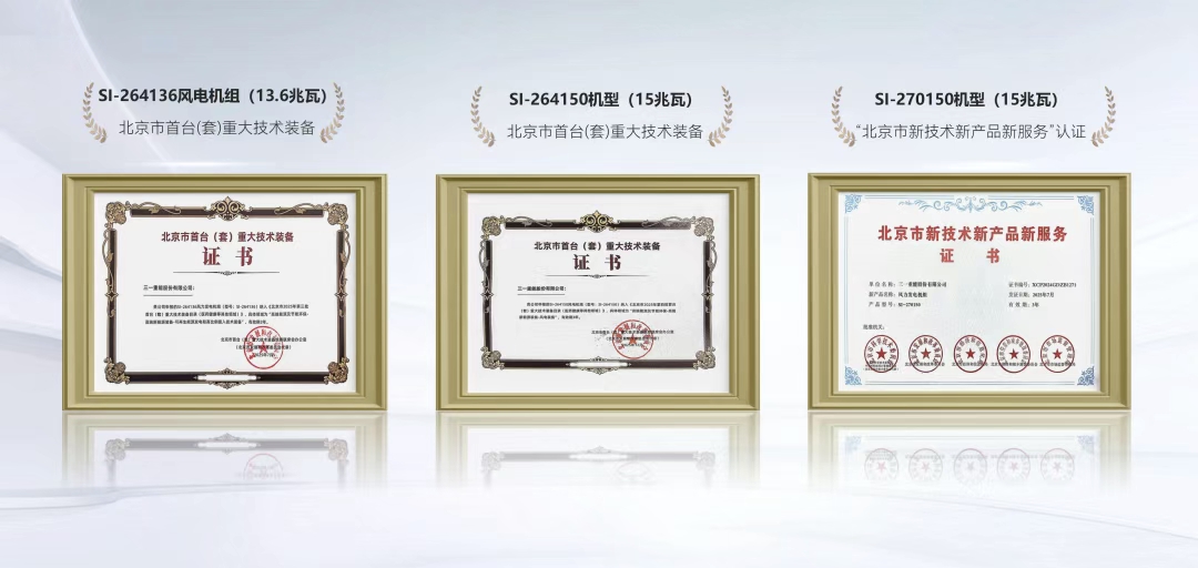 近日,好体育综合app下载重能15MW风电机组SI-264150正式获得“北京市首台(套)重大技术装备”认证。这是继同平台SI-270150(15MW)机型、SI-264136(13.6MW)机型获"北京市新技术新产品新服务"认证和"北京市首台(套)重大技术装备产品"认证后,好体育综合app下载重能大兆瓦风机斩获的又一政府层面认证。