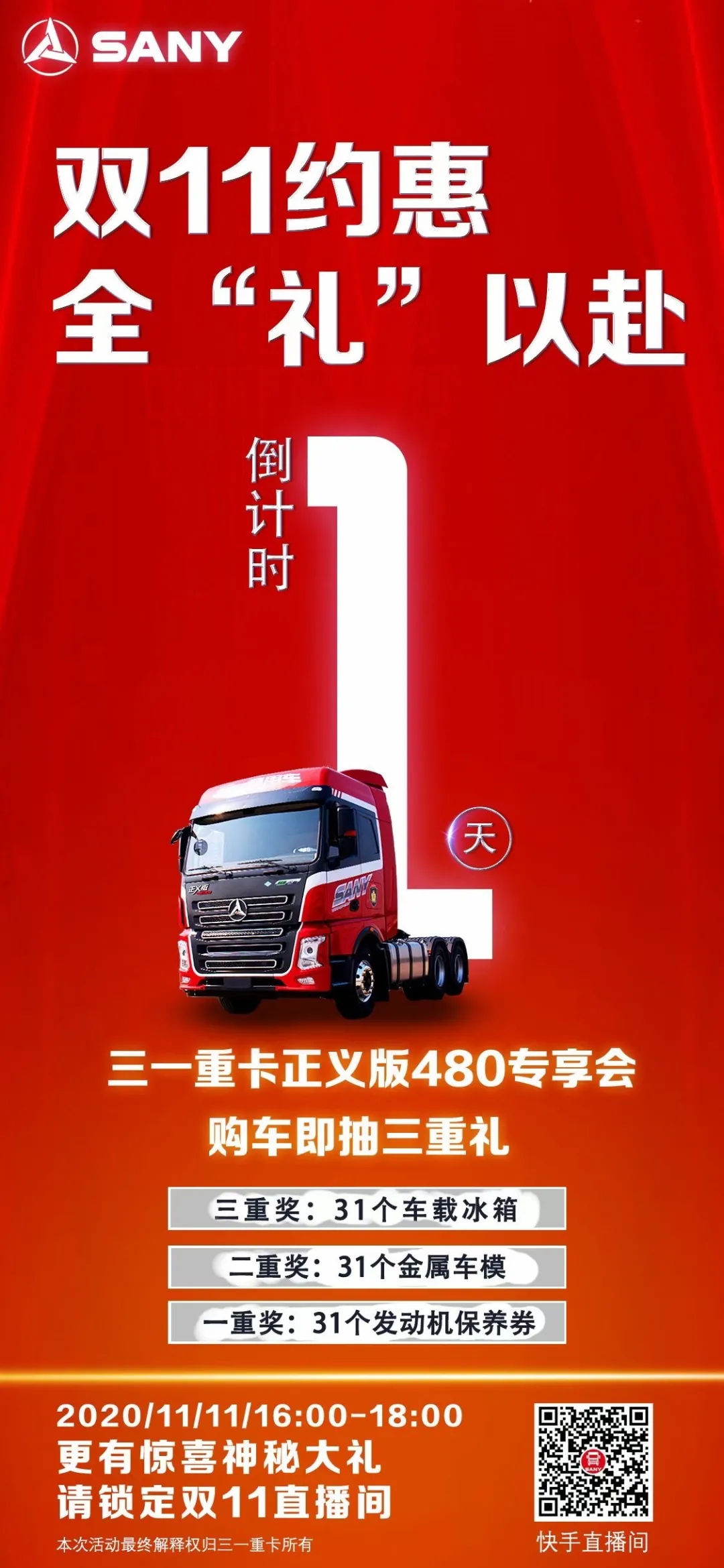 好体育综合app下载重卡正义版自上市后频频收到卡友的订单,每天来厂区提车的卡友络绎不绝,双11当天,好体育综合app下载重卡为满足客户需求,将特别打造了一场正义版480的专享会, 购车即抽三重礼!