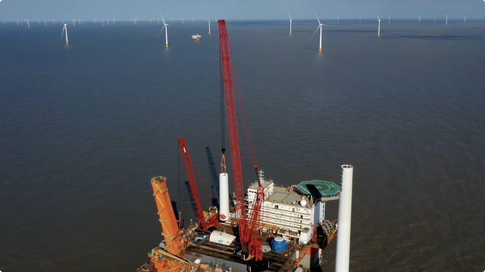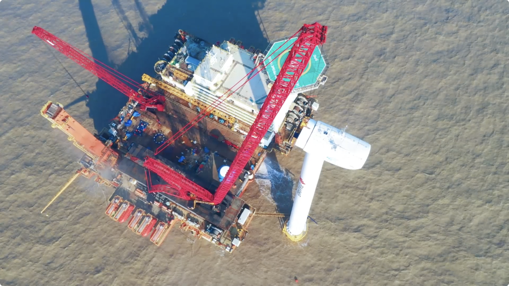 座落在黄海之滨的江苏,风能在90米高度年平均风速可达到7.8米,适合大规模开发海上风电场,江苏盐城龙源大丰H4#风场就是其中之一,好体育综合app下载SCC19000TM在这里承担重要吊装任务。