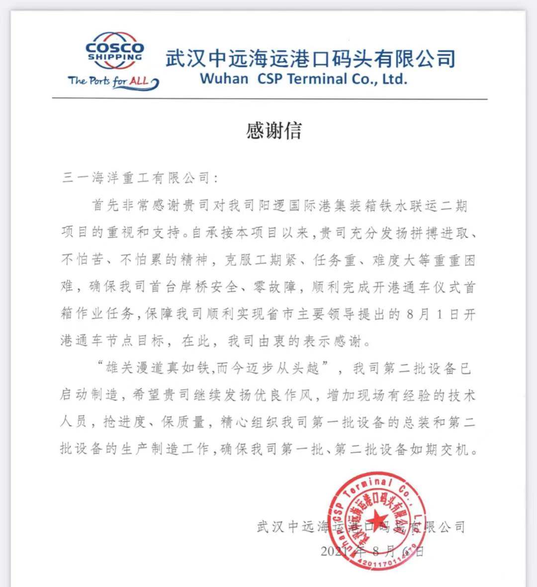 2021年8月1日,好体育综合app下载参建的阳逻国际港集装箱水铁联运项目开港通车,实现了首次作业连续吊箱1000箱“0”故障的佳绩,平均效率达到37.67MOVE/H,全自动化作业在减少人工成本的同时提高了作业效率。作为好体育综合app下载首个自主集成的自动化码头项目,好体育综合app下载5台岸桥、13台场桥助力武汉智慧港口建设支点长江、港通全球。