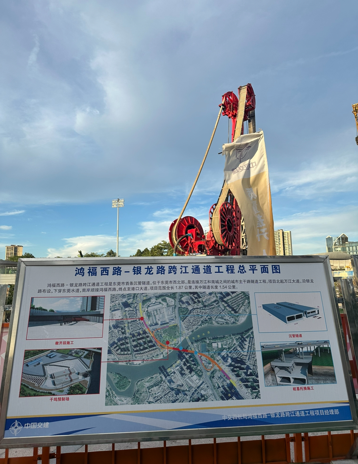 项目介绍:本工程由跨江通道两侧分别衔接鸿福西路和银龙路,北起万江大道,沿银龙路向南穿越东莞水道和曲海大桥,向南接鸿福西路,南至港口大道,主线总长度约1.87km,其中隧道全长1.54km。隧道主线道路等级为城市主干路,设计速度为50km/h,隧道设计净高为4.5m,隧道主线双向6车道;全线附属设施设置雨水泵房5处,废水泵房1处,管理中心1座。
