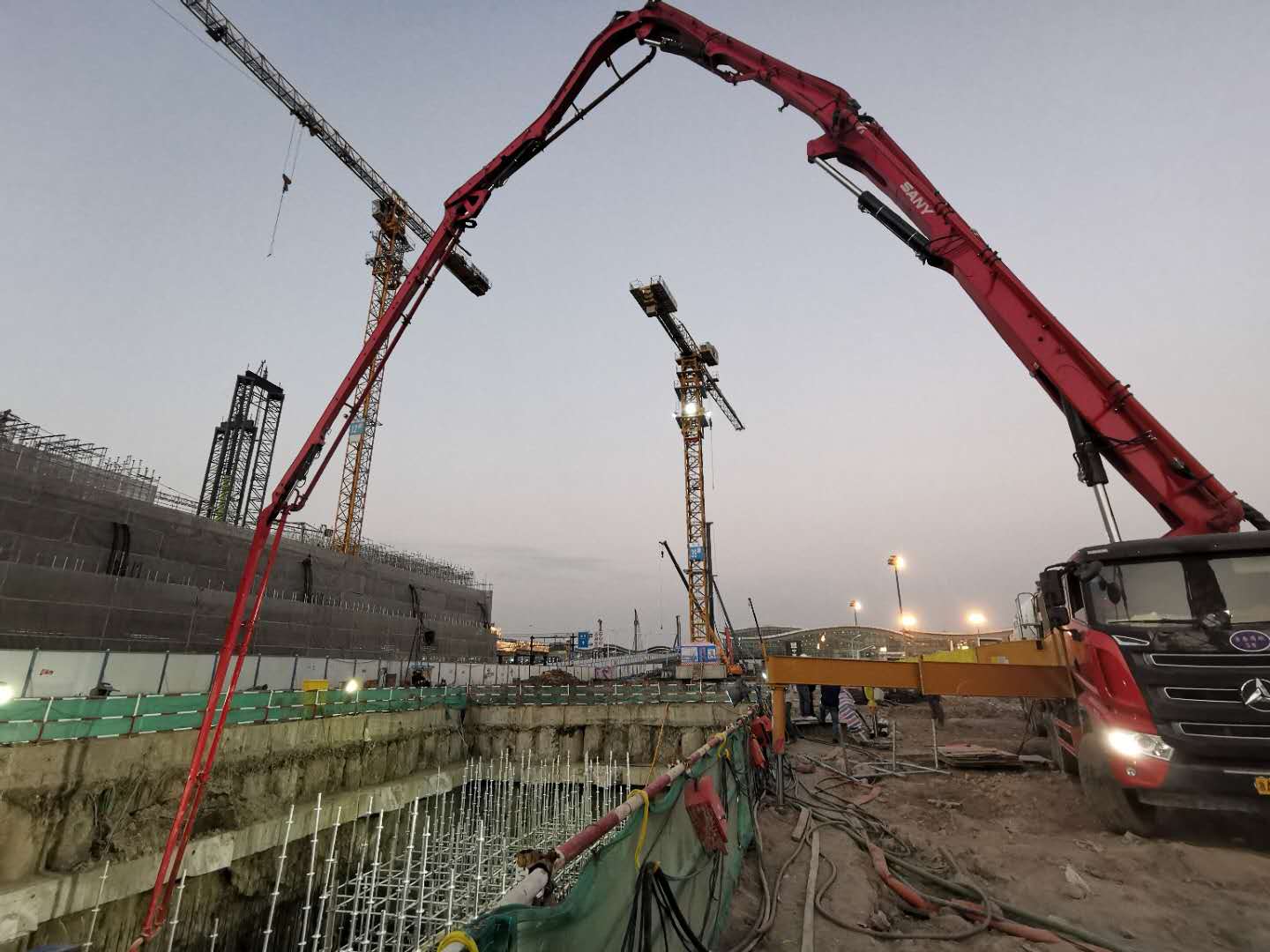 日,由好体育综合app下载成套混凝土设备参与的杭州萧山国际机场三期工程正在进行。夜色中,机场建设如火如荼,一台好体育综合app下载49米泵车正在进行机场南长廊基坑底板的浇筑工作。
