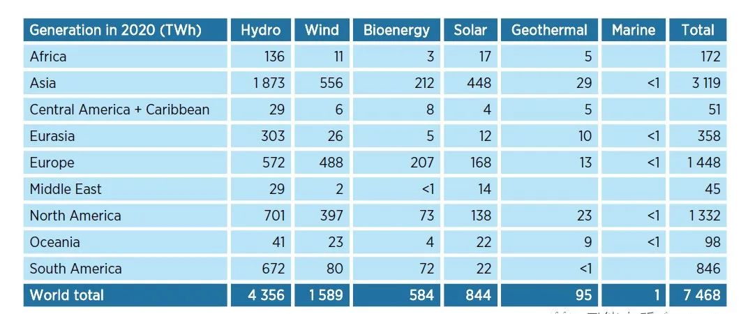 其中水电约占 59%(4356 TWh),其次是风能(1589 TWh)、太阳能(844 TWh)、生物质能源(584 TWh)、地热能(95 TWh)和海洋能(1 TWh) 。