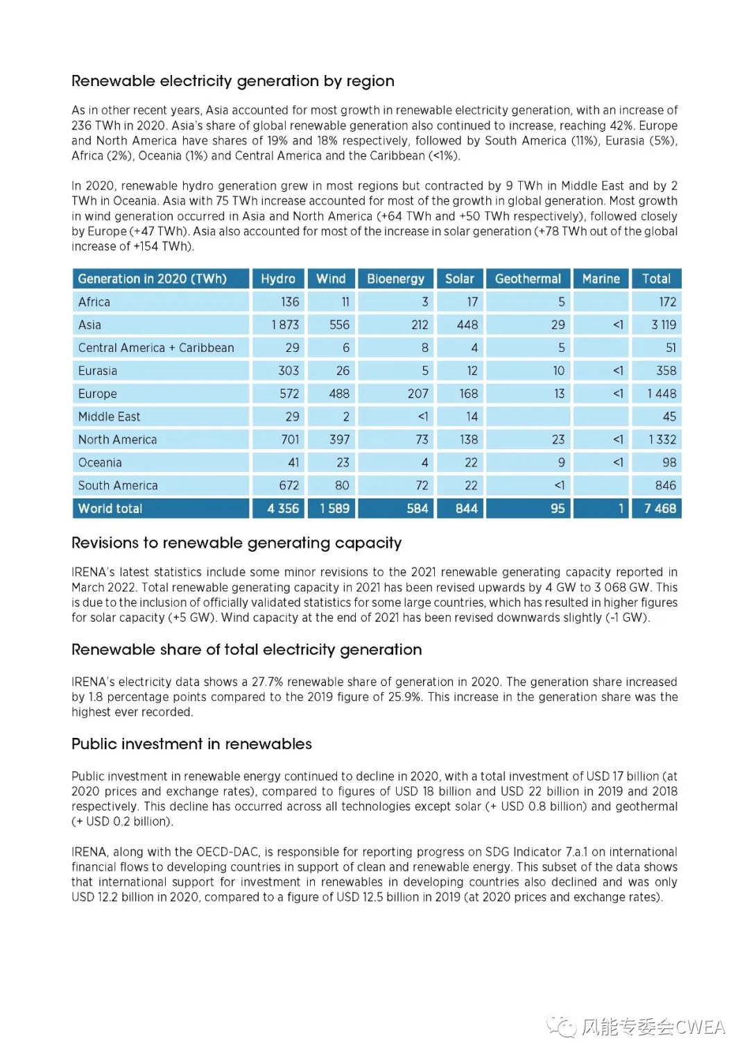 IRENA 的最新统计数据包括对 2022 年 3 月报告的 2021 年可再生能源发电量的一些小幅修订。2021年可再生能源发电总量上调了 4 GW至 3068 GW。这是因为包含了一些大的国家的官方验证统计数据,这导致太阳能发电量数据往上调整了5 GW。而截止 2021 年底的风电装机容量已小幅下调了1GW。