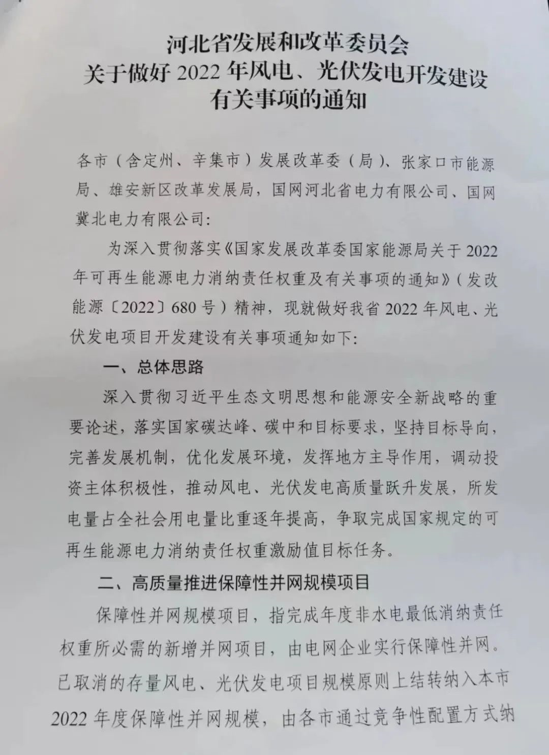 近日,河北省发改委下发《关于做好2022年风电、光伏发电开发建设有关事项的通知》,通知指出:2022年度河北省各市拟安排2022年保障性风、光规模5.24GW、市场化10GW、储备15GW。