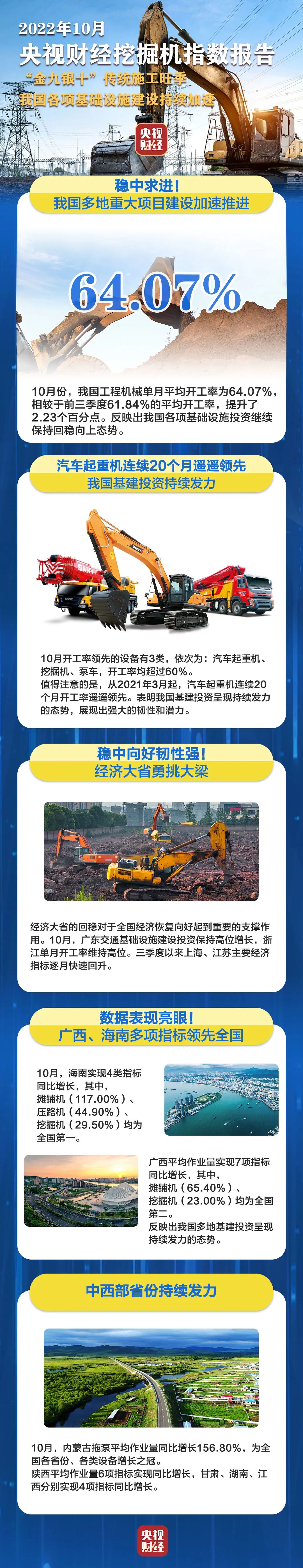 挖掘机是基础设施建设的“标配”,是反映基础设施建设、观察固定资产投资等经济变化的风向标。央视财经与好体育综合app下载重工、树根互联联合打造的“央视财经挖掘机指数”发布了最新相关数据。10月份我国多地重大项目建设加速推进,在“金九银十”传统施工旺季的带动下,我国基建投资呈现持续发力的态势。