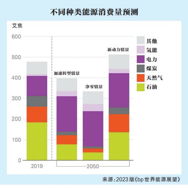 全球能源需求的变化主要有4个趋势:石油和天然气的地位逐渐下降、可再生能源消费快速增长、电气化的普及,以及低碳氢能的大规模应用。《bp世界能源展望》围绕3种能源转型情景展开,包括净零情景、加速转型情景和新动力情景。净零情景和加速转型情景假定全球气候政策大幅收紧。在净零情景下,到2050年,全球碳排放量将比2019年的水平减少约95%。在加速转型情景下,到2050年,全球碳排放量将减少约75%。社会观念和消费者行为的转变,将进一步提高能源利用效率,并增加低碳能源的使用。新动力情景旨在反映当前全球能源系统的整体运行轨迹,并将近年来各国政府的脱碳政策和承诺纳入考量。