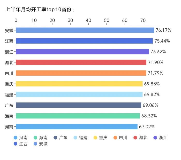 上半年,31个省份中5个省份开工率均超过70%,19省份开工率均超过60%。单月开工率前三为安徽(76.17%)、江西(75.44%)、浙江(73.32%)。