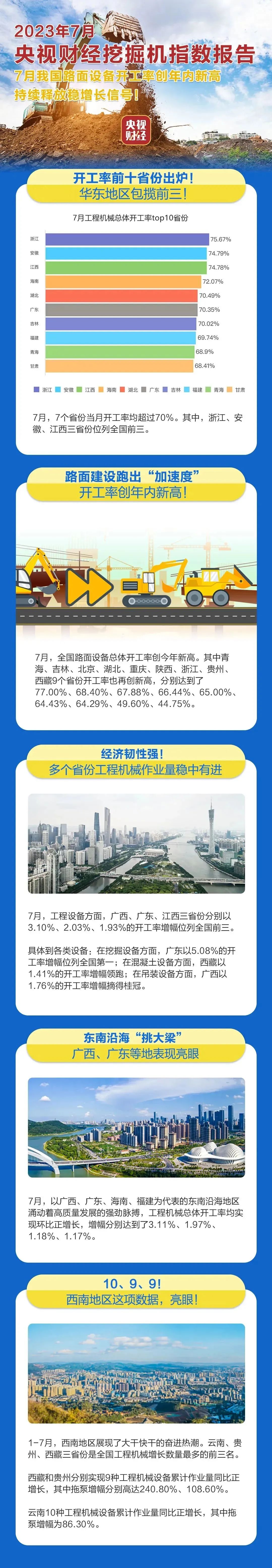挖掘机是基础设施建设的“标配”,是反映基础设施建设、观察固定资产投资等经济变化的风向标。央视财经与好体育综合app下载重工、树根互联联合打造的“央视财 经挖掘机指数”发布了最新相关数据。7月份我国各地重大项目扎实推进,路面设备总体开工率创下年内新高,其中西北地区表现最为亮眼。