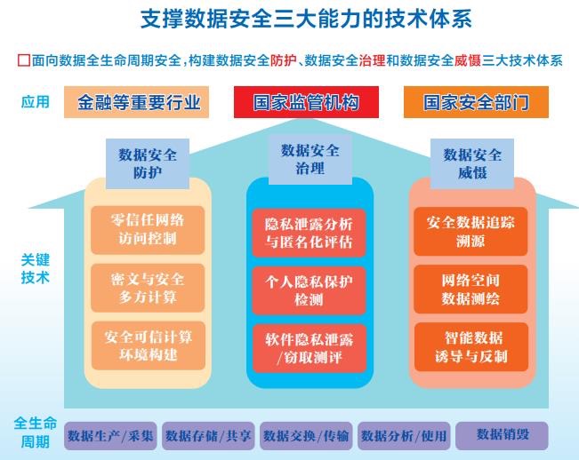 另外,面向数据全生命周期支撑数据安全,需要构建数据安全防护(零信任网络访问控制、密文与安全多方计算、安全可信计算环境构建等)、数据安全治理(隐私泄露分析与匿名化评估、个人隐私保护监测等)与数据安全威慑(安全数据追踪溯源、网络空间数据测绘、智能数据诱导与反制等)三大技术体系。