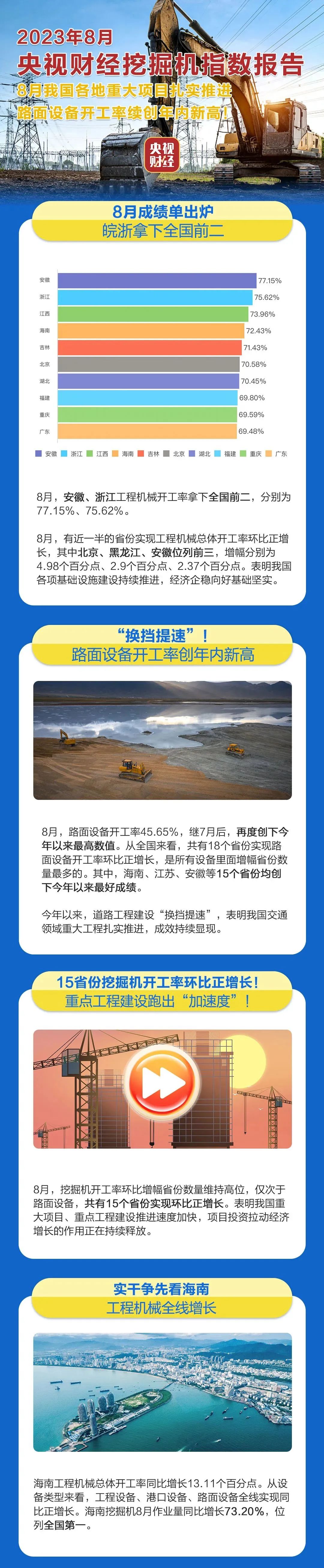 8月,安徽、浙江工程机械开工率拿下全国前二,分别为77.15%、75.62%。