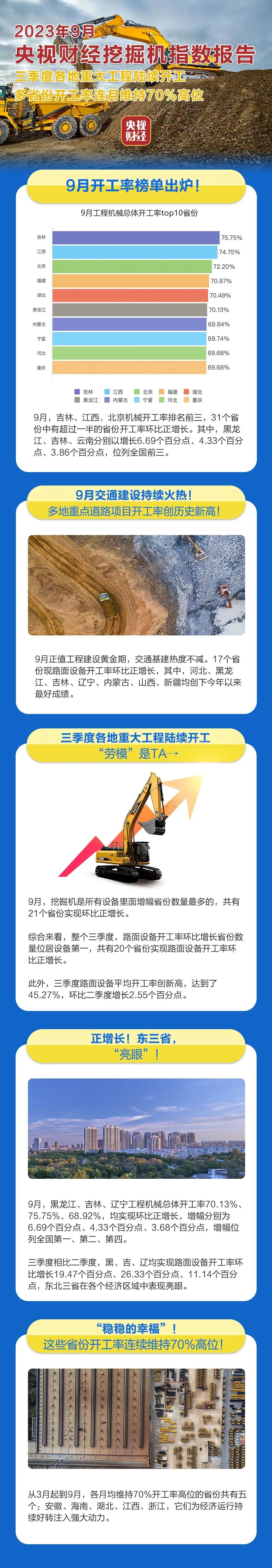 挖掘机是基础设施建设的“标配”,是反映基础设施建设、观察固定资产投资等经济变化的风向标。央视财经与好体育综合app下载重工、树根互联联合打造的“央视财经挖掘机指数”发布了最新相关数据。9月正值工程建设黄金期,交通基建热度不减,挖掘机也一直处于高开工状态,三季度多省份开工率连月维持70%高位。