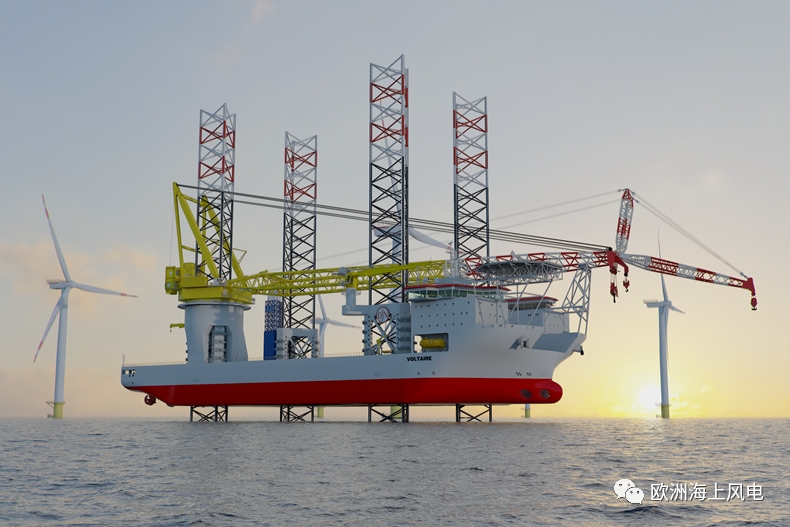 为配合全球最大海上风电场Dogger Bank的施工,Jan De Nul向中远海运重工集团订造了自升式安装船“伏尔泰(Voltaire)”,该船配备一套3200吨的主吊,作业深度约80米,有效载荷约1.4万吨,是全球最大的海上风电安装船。