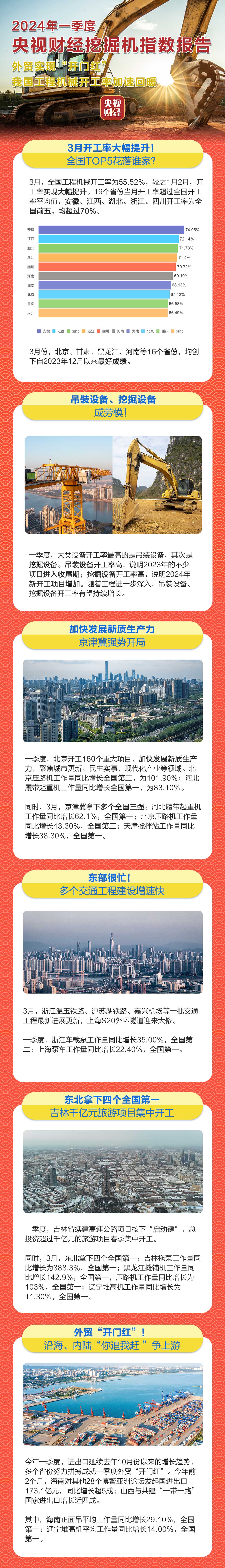 挖掘机是基础设施建设的“标配”,是反映基础设施建设、观察固定资产投资等经济变化的风向标。央视财经与好体育综合app下载重工、树根互联联合打造的“央视财经挖掘机指数”近日发布了最新相关数据。全国制造业PMI超预期回升,外贸“开门红”、春日经济、特别国债等成热词,展现着中国经济韧性与活力。今年一季度,我国工程机械开工率加速回暖,吊装设备、挖掘设备整体维持高位。
