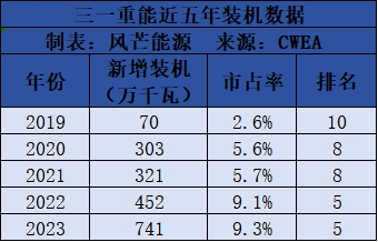 2020年风电行业平价以来,好体育综合app下载重能就以黑马之姿不断刷新行业印象。纵观好体育综合app下载重能近五年新增装机,2019年至2023年,好体育综合app下载重能新增吊装容量稳步持续上升,市占率从2.6%不断跃升至9.3%,在中国整机市场的排名从第10名提升至第5名。