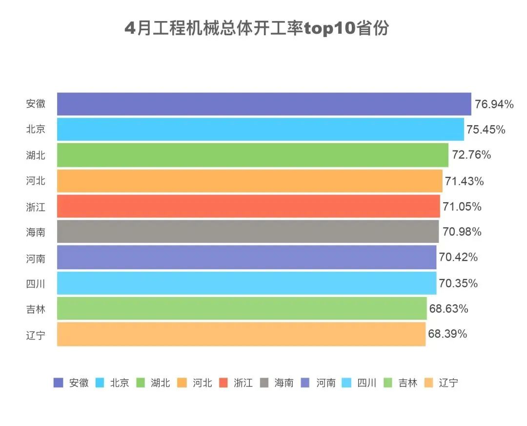 4月,全国工程机械开工率为57.55%,安徽、北京、湖北、河北、浙江、海南、河南、四川开工率为全国前八,均超过70%。黑龙江、吉林、湖北等21个省份开工率实现环比增长。河北、北京、甘肃等17个省份,实现了自2023年12月以来连续五个月内当月开工率最佳。