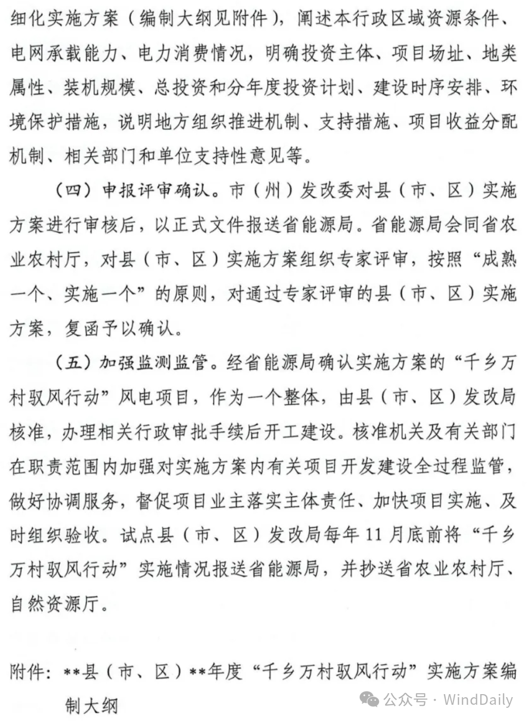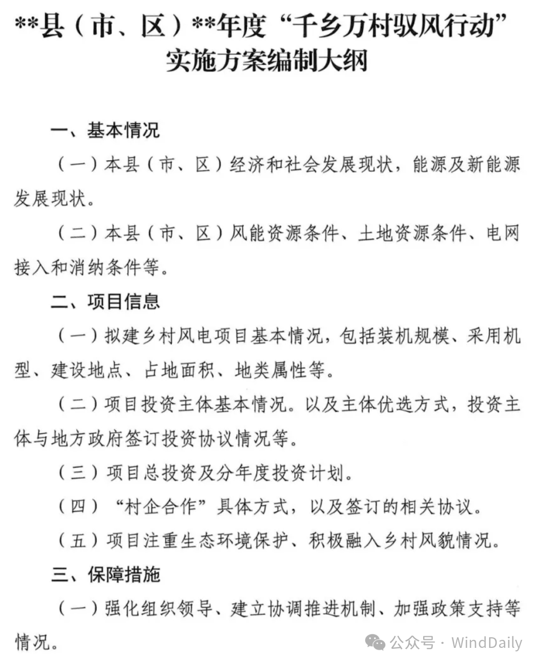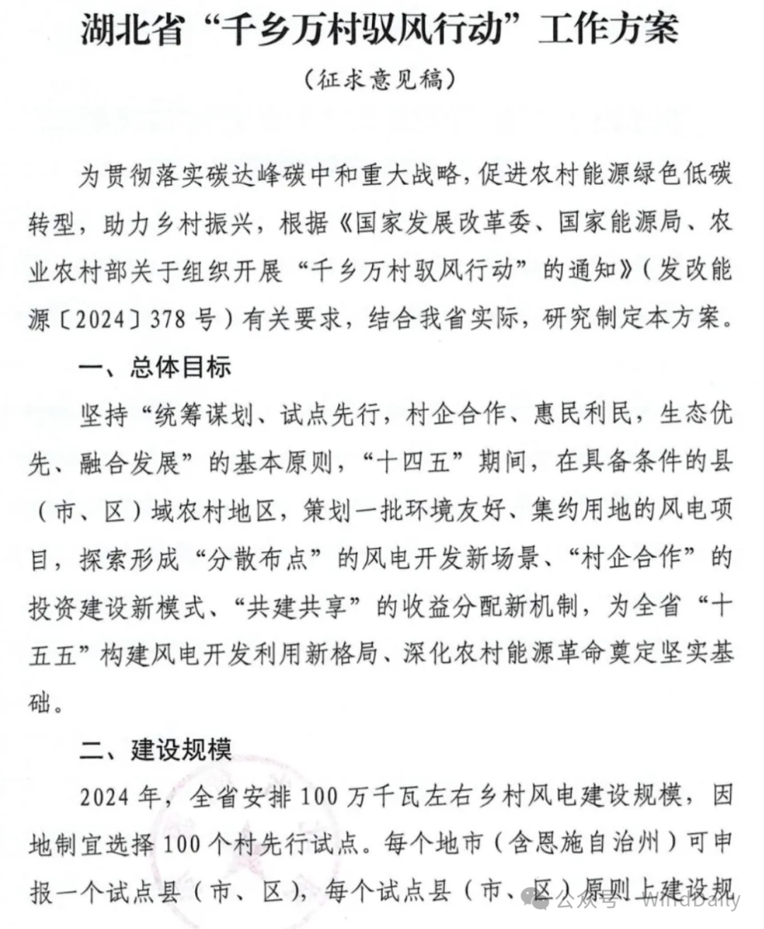WindDaily获悉,湖北省能源局近日正式发布《省能源局关于征求湖北省“千乡万村驭风行动”工作方案意见的函》。据文件,2024年,湖北省安排100万千瓦左右乡村风电建设规模,因地制宜选择100个村先行试点。每个地市(含恩施自治州)可申报一个试点县(市、区),每个试点县(市、区)原则上建设规模不超过7万千瓦,布点7-10个行政村,单个村不超过2万千瓦。潜江、仙桃市原则上建设规模不超过3万千瓦,布点3-5个行政村。天门市的乡村风电项目纳入国家农村能源革命试点县建设实施方案,不再重复申报。在项目选址方面要求风资源可利用小时数不低于1800小时,业主优选要同一省级企业原则上只参与一个试点县项目建设,同等条件下优先考虑在所属县市投资调峰储能能力项目的企业。具体如下: