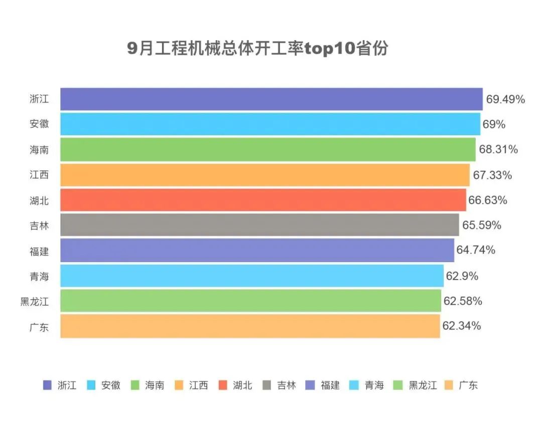 其中,安徽的吊装设备最为繁忙,三季度平均开工率为87.88%,远超全国平均水平;而浙江的挖掘设备则霸榜全国挖掘设备第一名,三季度平均开工率为77.92%,超出全国挖掘设备平均开工率25.85个百分点。