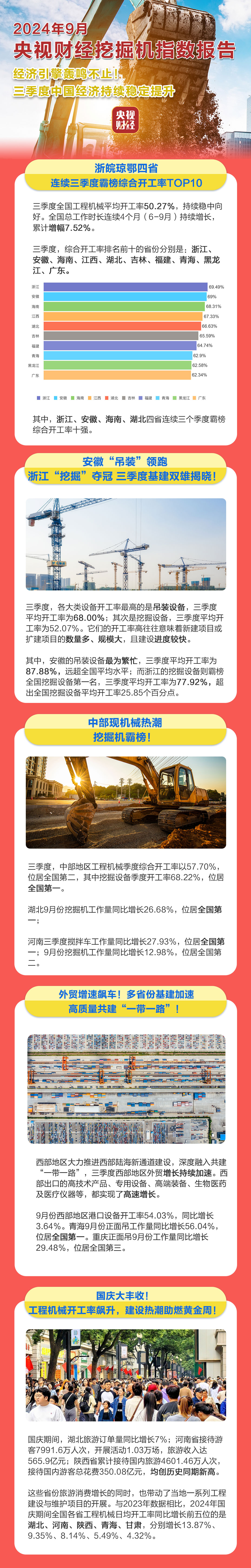 挖掘机是基础设施建设的“标配”,是反映基础设施建设、观察固定资产投资等经济变化的风向标。央视财经与好体育综合app下载重工、树根互联联合打造的“央视财经挖掘机指数”发布了最新相关数据。三季度,我国新建项目逐渐增多,全国工程机械总工作时长稳步提升,多个省份开工率持续增长。道路交通建设活跃,摊铺机和压路机总工作时长和开工率双双走高。