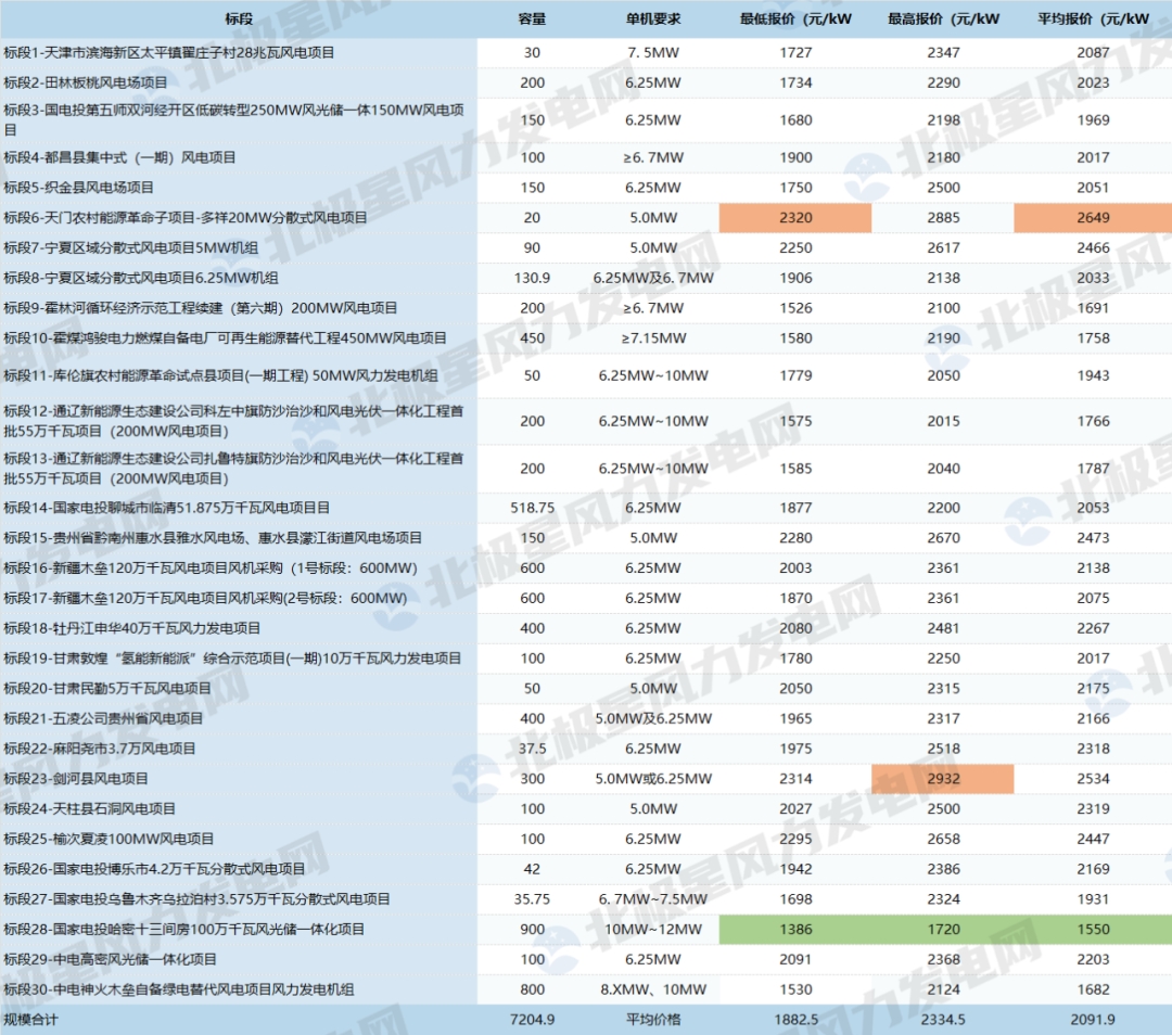 从开标结果来看。30个标段中,标段28-国家电投哈密十三间房100万千瓦风光储一体化项目风机报价最低,其最低价为风机最低报价1386元/kW,最高价报价为1720元/kW,风机平均报价1550元/kW。