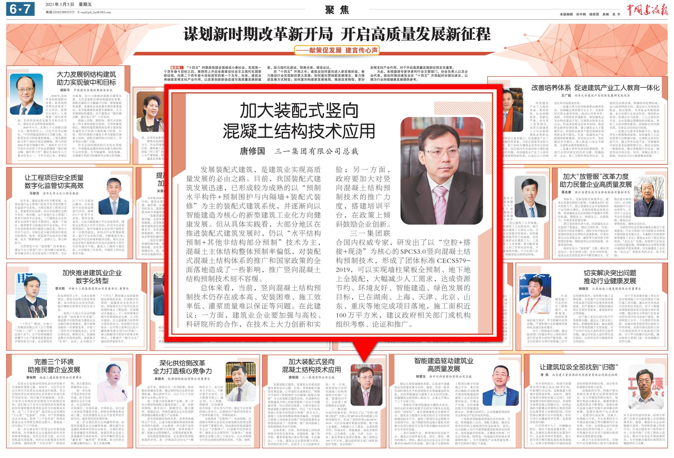 今天,中国建设报两会特刊刊登好体育综合app下载集团总裁唐修国“加大装配式竖向混凝土结构技术应用”的建议。内容如下:
