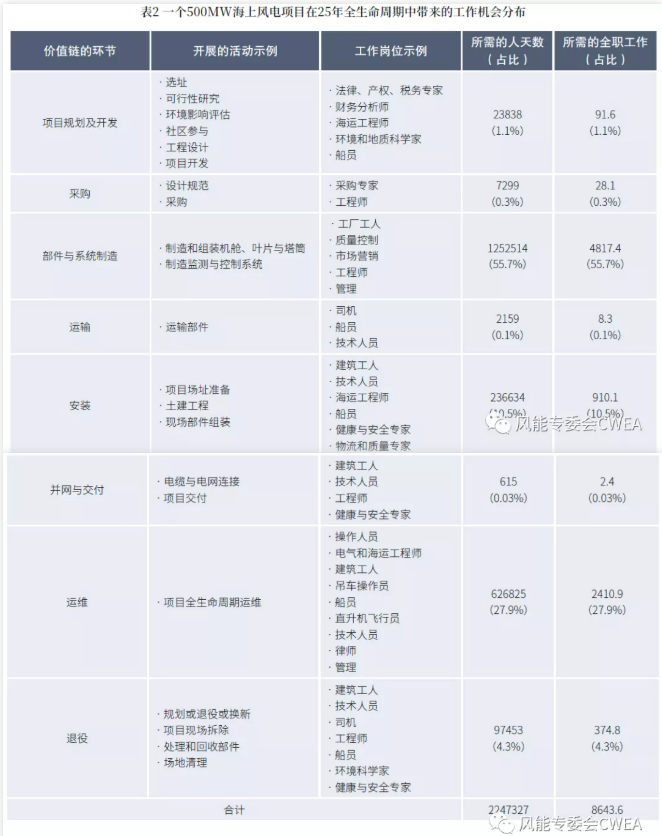 目前, 全球风电装机规模排名靠前的几个国家的风电直接从业人数合计达到数十万。根据全球风能理事会市场情报(GWEC MarketIntelligence)开展的一项全球性调查,截至2020年,中国的风电从业人数约为55万,巴西为26万,美国为11.5万,印度为6.3万。如果2021—2025年的470GW风电新增装机能够按时交付,全球风能理事会(GWEC)预计这些装机在全生命周期中将带来超过330万个工作机会。该测算是基于国际可再生能源署(IRENA) 关于陆上风电及海上风电项目创造工作岗位能力的计算(2017年及2018年)以及全球风能理事会(GWEC)对于未来风电市场增长的预测。需要注意的是,上述测算未考虑可能影响就业岗位创造的部分因素,比如技术进步、本地的健康与安全要求、国内劳动生产率以及规模经济。国际可再生能源署(IRENA)的研究显示,一个典型的50MW陆上风电项目在其25年全生命周期中,单位兆瓦装机将带来5.24个工作机会。一个典型的500MW海上风电项目在其25年全生命周期中,单位兆瓦装机会带来17.29人年(person-years)的工作机会。此类研究反映出到目前为止风电在创造就业方面的良好表现。比如,英国赫尔(Hull)地区通过发展风电机组组装业务,创造出超过1000个直接本地就业岗位。2020年,丹麦劳工运动经济委员会(Economic Council of the Labour Movement in Denmark)与丹麦工人联合会(United Federationof Danish Workers)发布的一份报告指出,与建立生物精炼厂以及取代燃油燃气锅炉等相比,海上风电开发带来的永久工作机会是最多的。在带动通常远离城市经济中心的沿海社区发展方面,海上风电能够发挥出特殊的价值。扩大本地就业规模与加快工业发展有助于推动这些地区的经济繁荣。纽约州能源研究和开发管理局(NYSERDA)对美国海上风电创造就业岗位情况的研究显示,在一个海上风电项目全生命周期所需要开展的工作中,2/3都可以由美国工人来完成。即便如此,由于缺少本地生产设施和训练有素的劳动力等,并不是所有的市场都十分重视价值链中的采购与制造环节。对于此类产业链发展仍处于前期阶段的市场而言,突出这样的路径是至关重要的,即利用已有的能力、专长以及产业来让本地价值创造最大化。在那些依赖进口部件的市场中,风电的安装、并网、运维和退役工作仍需要由本国工人完成。为了在这些地区最大限度地发挥好短期的创造就业潜力,在国内市场识别出“准备充分”(shovel-ready)的项目,比如获得规划许可及进入工程准备阶段(pre-construction stage)的项目,就变得十分关键。一旦生产与运营能力得到恢复,就可以迅速推进这些项目的开发活动,并能够从本地雇用到建筑工人、司机、技术人员、工程师等。要想让那些国内制造水平较低的市场最大限度地获得风电开发的价值,就必须保持稳定、持续的“准备充分”项目的储备,这离不开高效、透明的审批许可流程。因此,有助于简化风电项目许可流程的绿色复苏行动能够释放运输、安装、交付环节中的就业创造能力。在一个陆上风电项目所需的劳动力资源中,这三个环节占到一半以上。