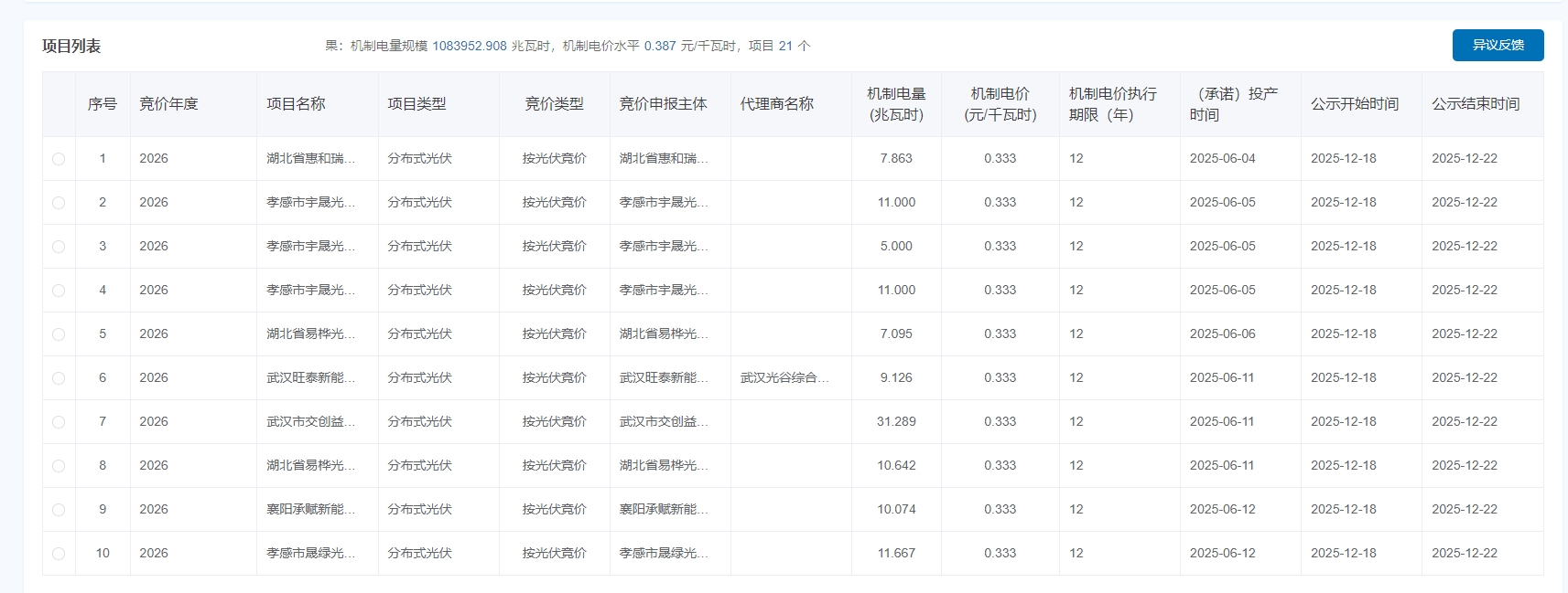 光伏竞价项目竞价出清结果:机制电量规模488361.054兆瓦时,机制电价水平0.333元/千瓦时,项目20520个。