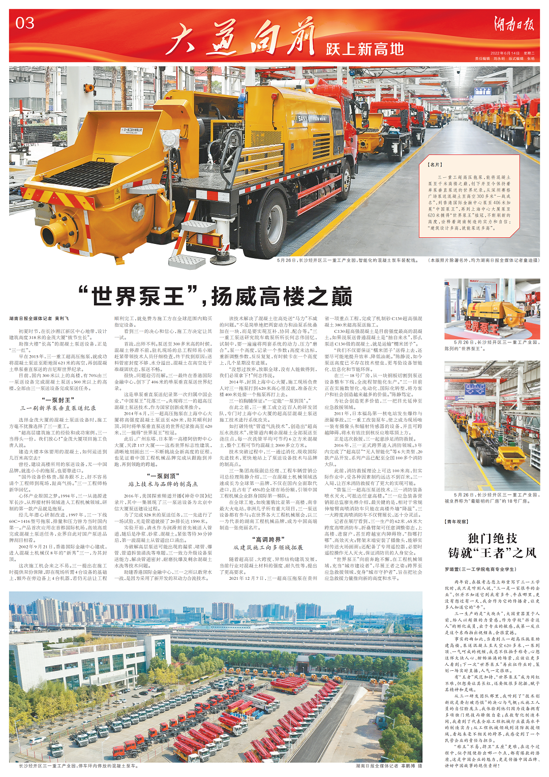 初夏时节,在长沙湘江新区中心地带,设计建筑高度318米的金茂大厦“拔节生长”。助推大楼“长高”的混凝土泵送设备,正是“好体育综合app下载红”。早在2015年,好体育综合app下载重工超高压拖泵,就成功将混凝土泵送至距地面621米的高空,再创混凝土单泵垂直泵送的吉尼斯世界纪录。