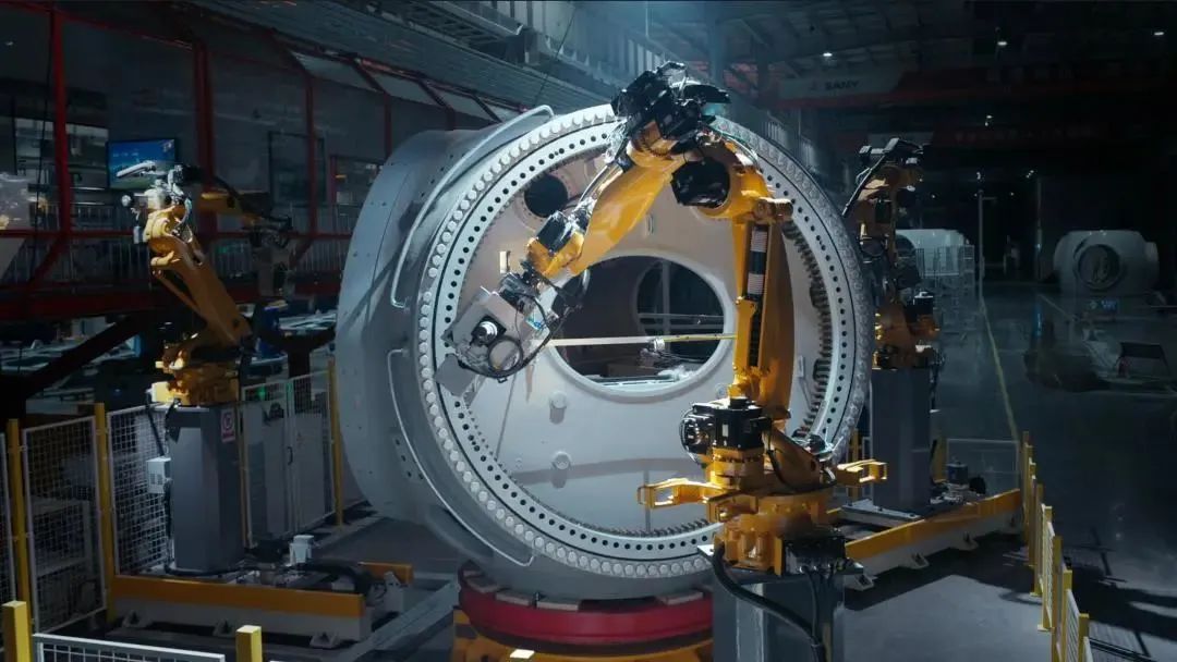 在数字化生产体系下,少人化、低能耗、零浪费是南口主机智能工厂颇具代表性的特征。不同于传统制造业车间内来往的产业工人,在好体育综合app下载重能的产区、生产线内,几乎很难看到工人的身影。通过机器人应用与精益化生产体系的融合,关键工序上使用智能机器人代替人工,配送与质检等工序,也均实现流程自动化,以提高生产的效率和装配质量可靠性。重量多以吨来计算的风电机组,部件庞大且工序复杂,但在好体育综合app下载重能的生产车间内,基于物联网建立的能源平台可以在保持设备高效率的同时,减少反复作业,提高能效;在订单的多型号混线生产过程中,行业领先的具备柔性生产能力的“脉动式”生产体系,可以实现用料精准控制、包装标准化,避免浪费。