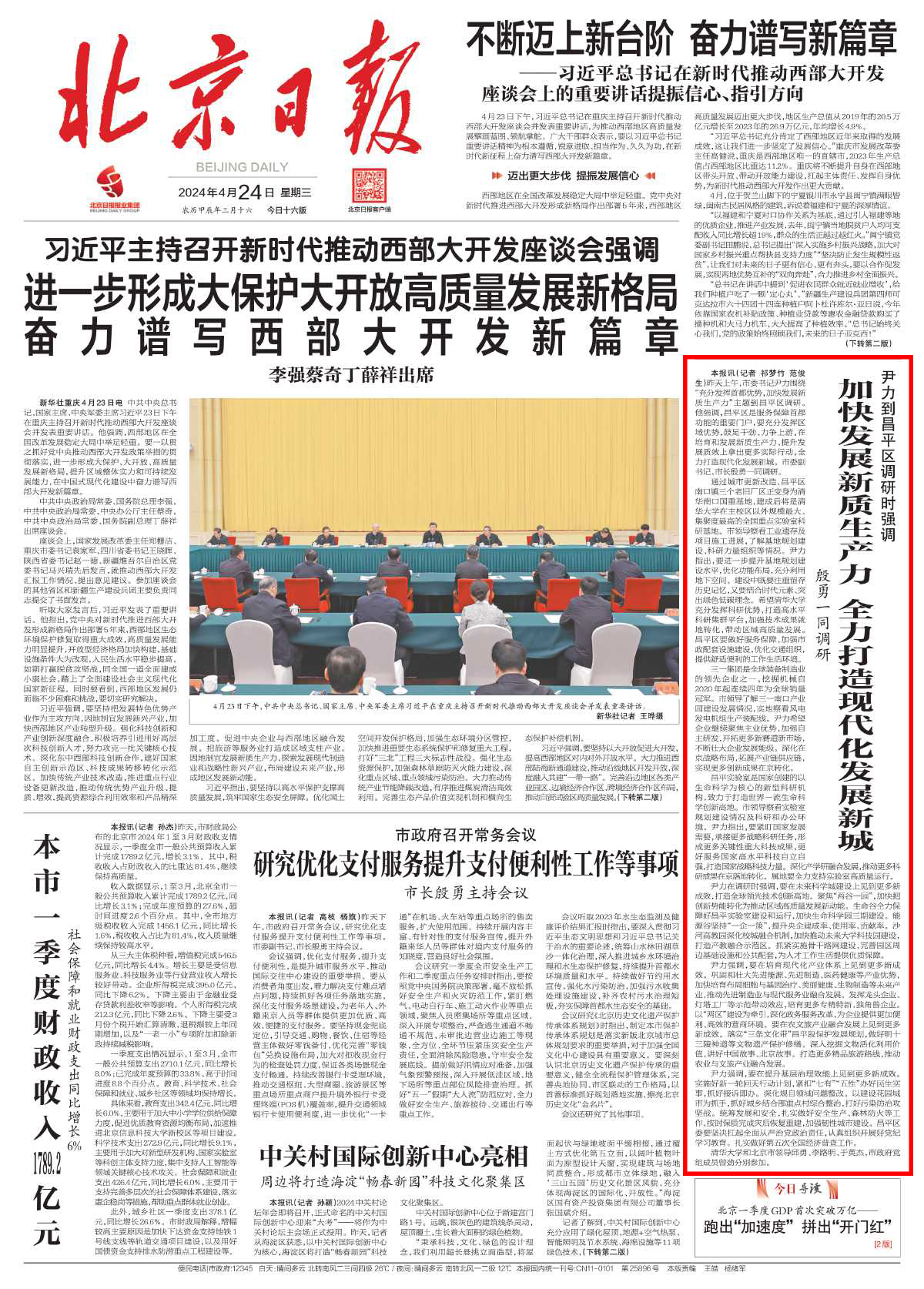 4月23日上午,北京市委书记尹力围绕“充分发挥首都优势,加快发展新质生产力”主题到昌平区调研。他强调,昌平区是服务保障首都功能的重要门户,要充分发挥区域优势,鼓足干劲、力争上游,在培育和发展新质生产力、提升发展质效上拿出更多实际行动,全力打造现代化发展新城。市委副书记、市长殷勇一同调研。