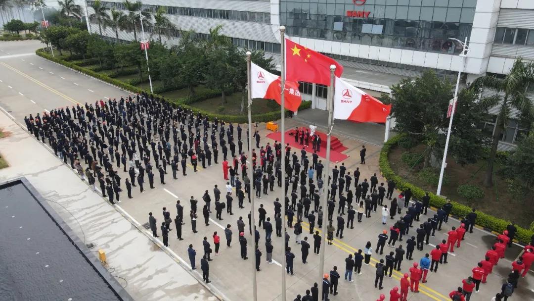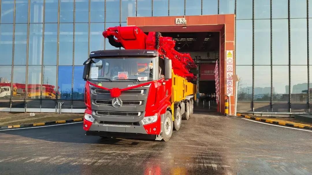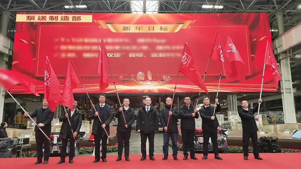 2月5日8点18分,泵送公司总经理陈添明、副总经理兼制造部部监刘志福、泵送公司全体同仁相聚在18号厂房,挥舞旗帜奔向新年目标,喜迎2022年新春第一台泵车下线!
