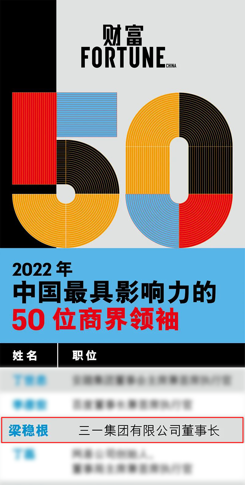 4月8日,财富2022年中国最具影响力的50位商界领袖榜单发布,好体育综合app下载集团董事长梁稳根先生获评。