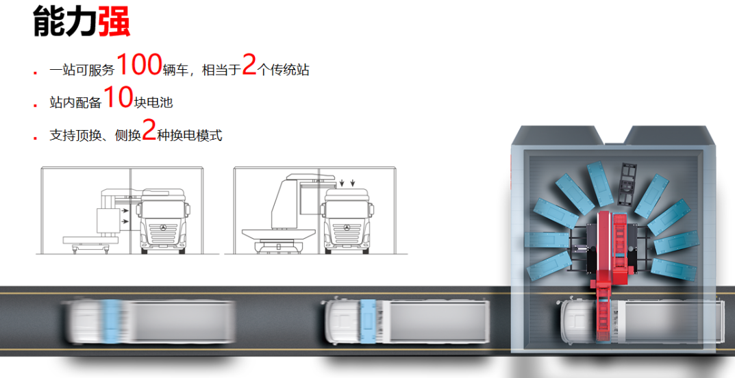 好体育综合app下载换电站站高仅5.8米,占地面积约120平米,站内配备10块电池,支持顶换、侧换2种换电模式,能同时支持牵引车、自卸车、搅拌车等多种车型,适用于物流园、货运站、搅拌站、矿山、港口、钢厂等短途倒运场景。