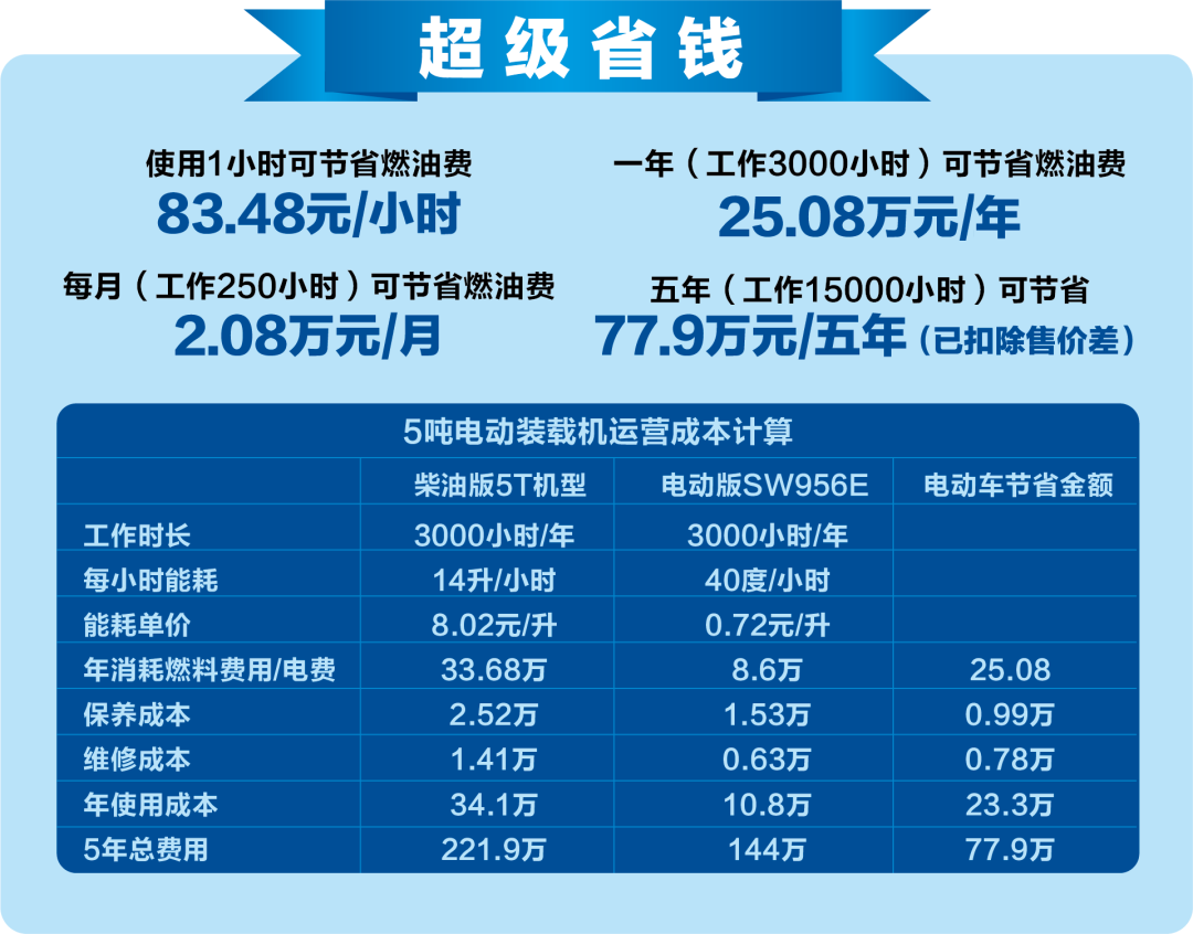 往长远来算,这笔账更让人惊喜,SW956E采用大功率永磁同步电机,标配宁德时代282度电池,搭载电池智能控温系统,使得设备始终维持在最佳工作状态,高效低耗,五年(以工作15000小时计算)可节省77.9万。