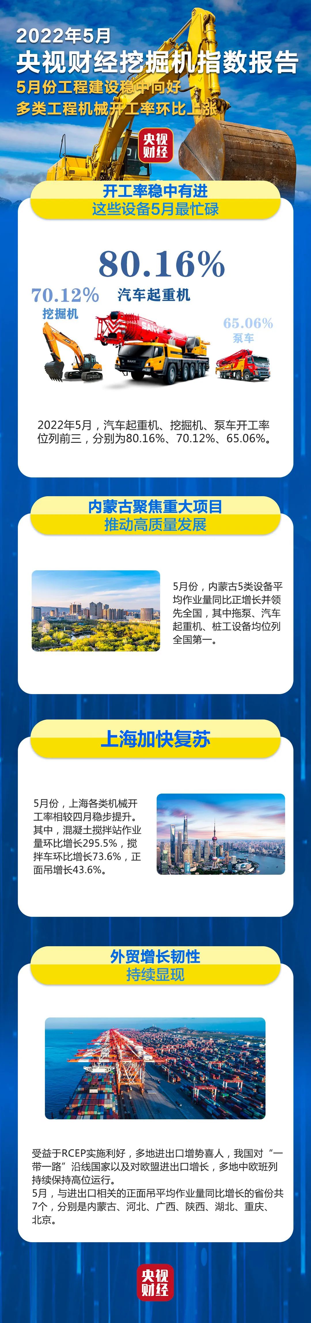挖掘机是基础设施建设的“标配”,是反映基础设施建设、观察固定资产投资等经济变化的风向标。央视财经与好体育综合app下载重工、树根互联联合打造的“央视财经挖掘机指数”今天发布了最新相关数据。5月份,我国各类工程机械设备整体作业量继续稳中向好,内蒙古、宁夏等地区基础设施建设持续活跃。