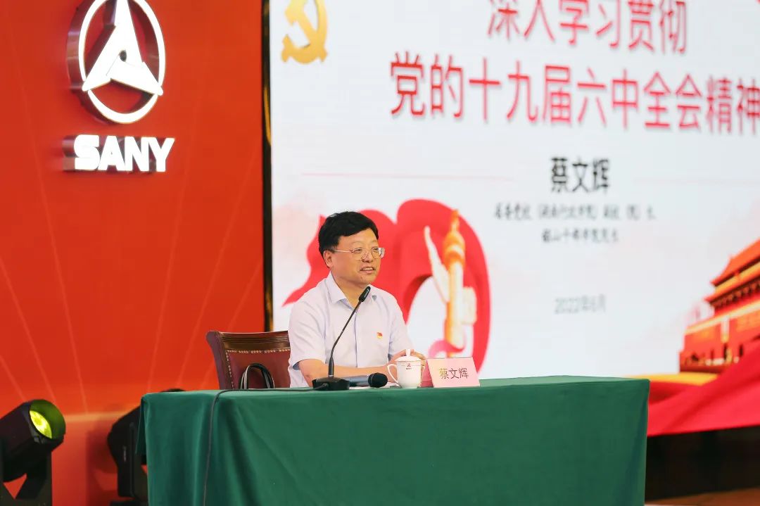 蔡文辉向在座党员传达中国共产党第十九届六中全会精神。