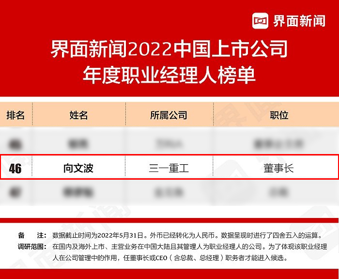 近日,界面新闻发布2022中国上市公司年度职业经理人榜单,好体育综合app下载重工董事长向文波榜上有名,连续四年蝉联“上市公司年度职业经理人”称号。