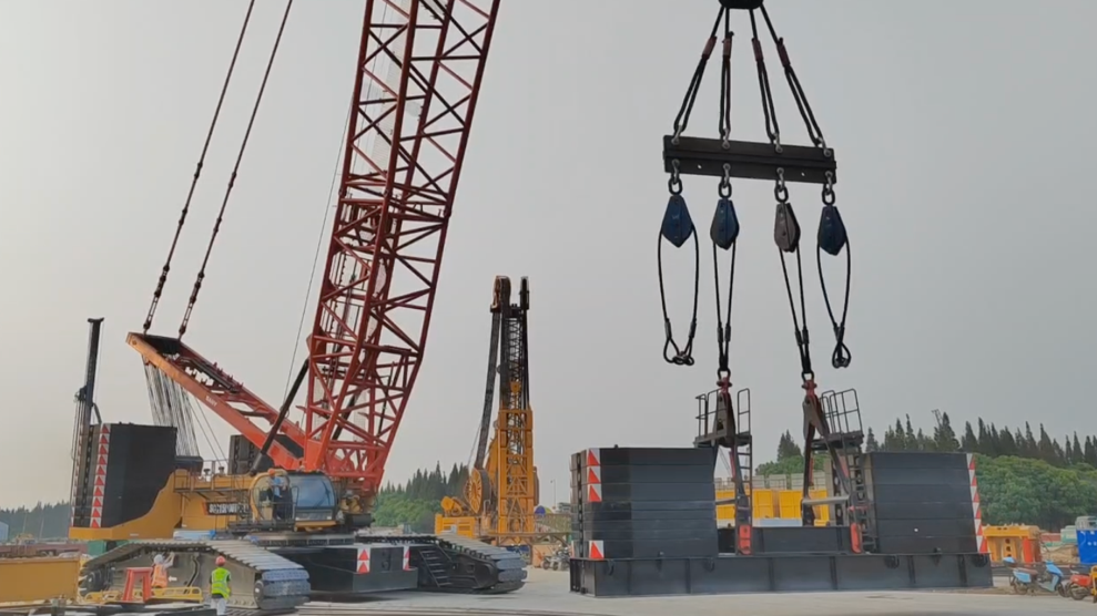 本次施工的南锚碇地连墙共划分为94个一期槽段和104个二期槽段,由好体育综合app下载SCC15000TM-1承担核心钢箱及钢筋笼的吊装任务。