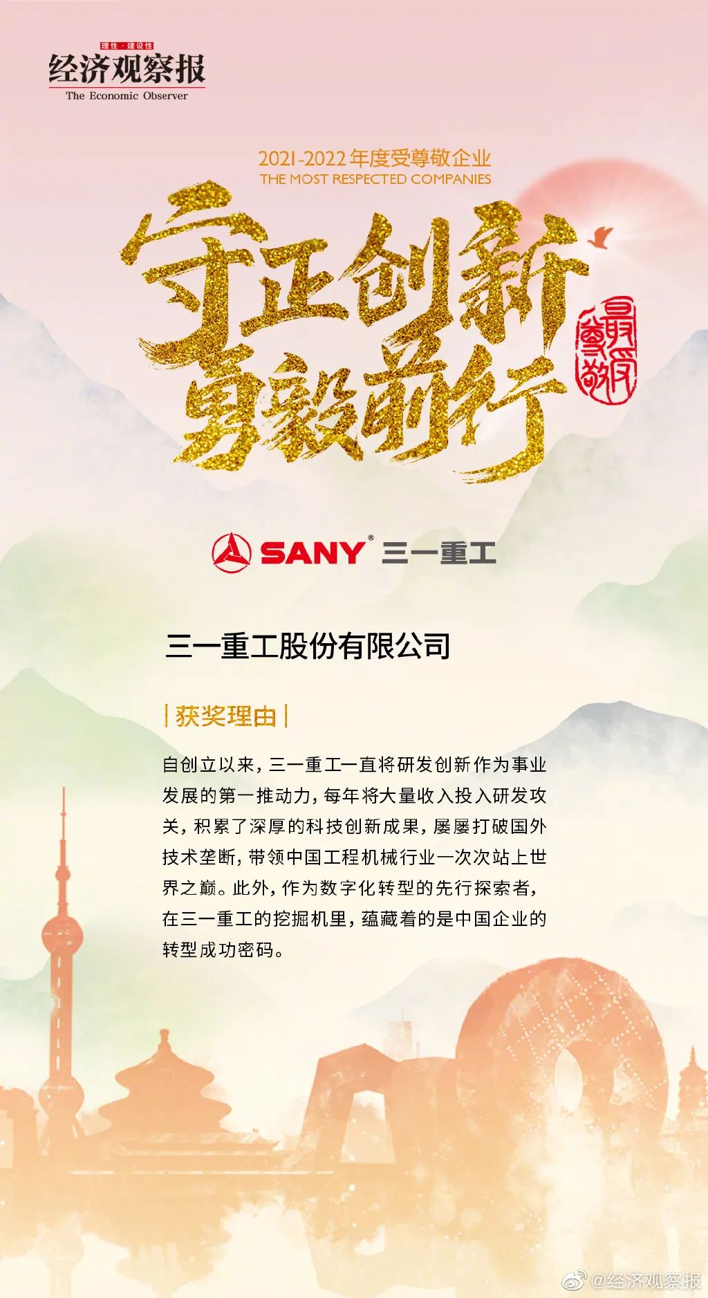 近日,经济观察报2021-2022年度中国最受尊敬企业线上峰会暨颁奖盛典举办,好体育综合app下载重工荣获“中国最受尊敬企业”称号。