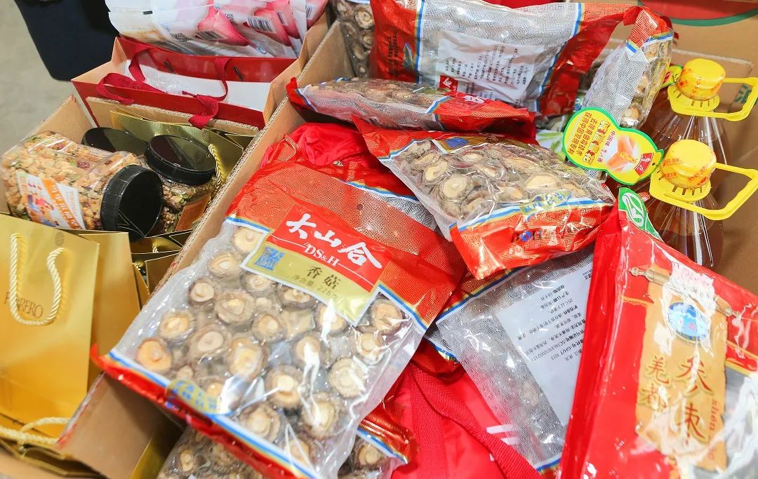 近千平米的空间里,酒水、坚果、糖果、肉脯、山产干货、大米粮油、茶叶、模型礼盒等各类年货可谓是应有尽有,几千箱过年物资满满当当,摞出了一道道“年货墙”。