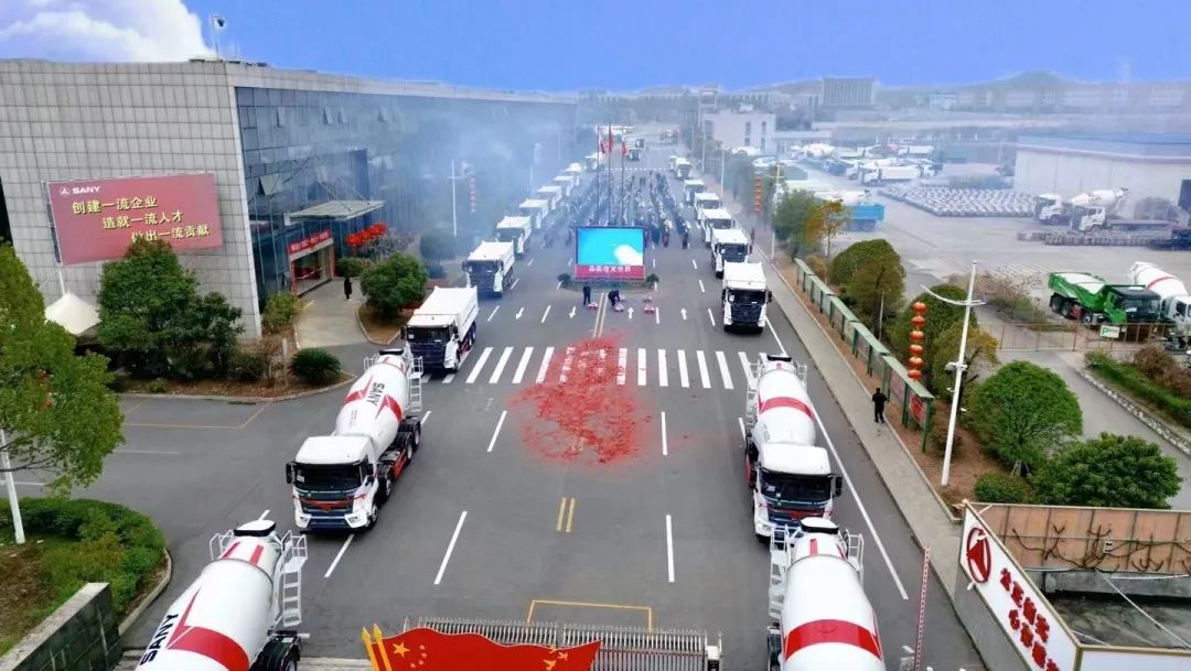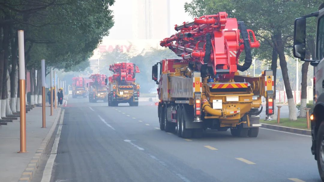 邵阳产业园,188台身披红花的搅拌车、自卸车排成了2公里长龙缓缓从厂区驶过,从厂门鱼贯而出,吸引大量市民驻足观看。