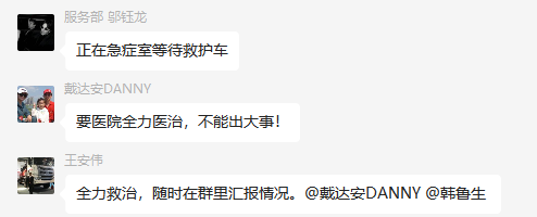 根据集团防疫政策,邬钰龙第一时间向区域经理韩鲁生汇报。马上,一个汇集研究院、CEO办公室、事业部人资、董事长办公室、人资总部等各级领导的专项微信群迅速组建起来,实时同步、协调抢救工作,尽全力给予全方位的帮助。