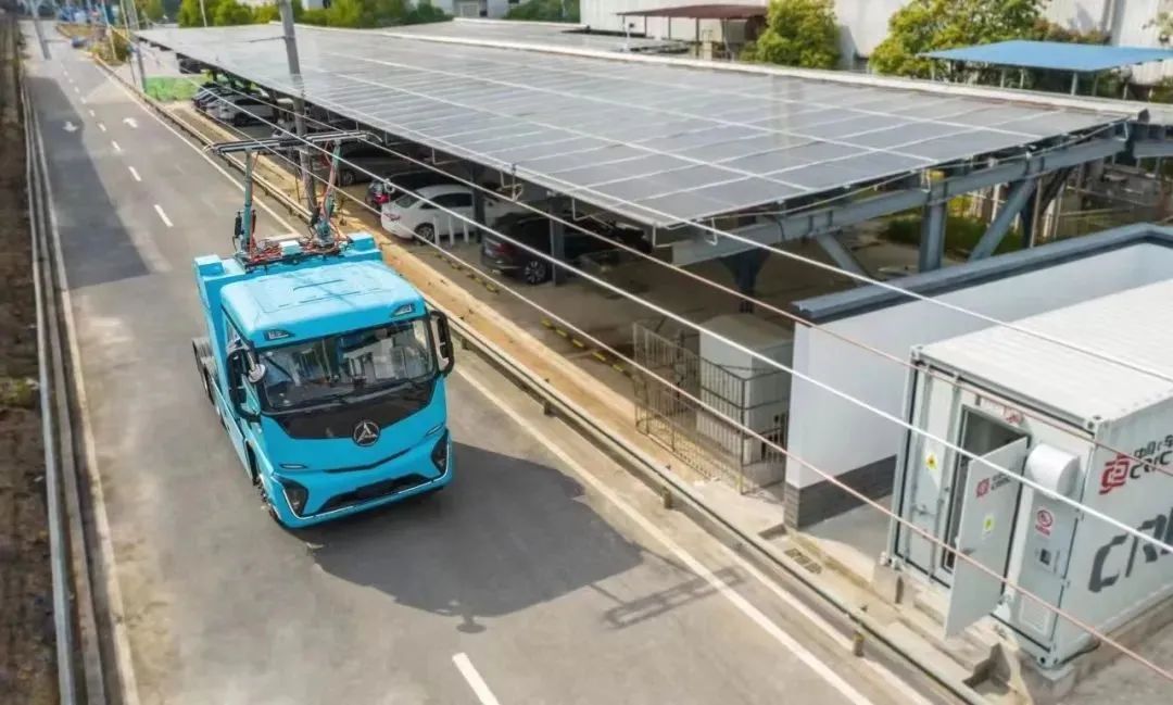 这条电气化公路采用类似轨道交通的架空接触网方式,由上方的电网供能直驱,实现行驶车辆的“边行驶边充电”。据介绍,相比使用动力电池的纯电重卡,可以有效避免低温效应,能源利用效率提升6%以上。