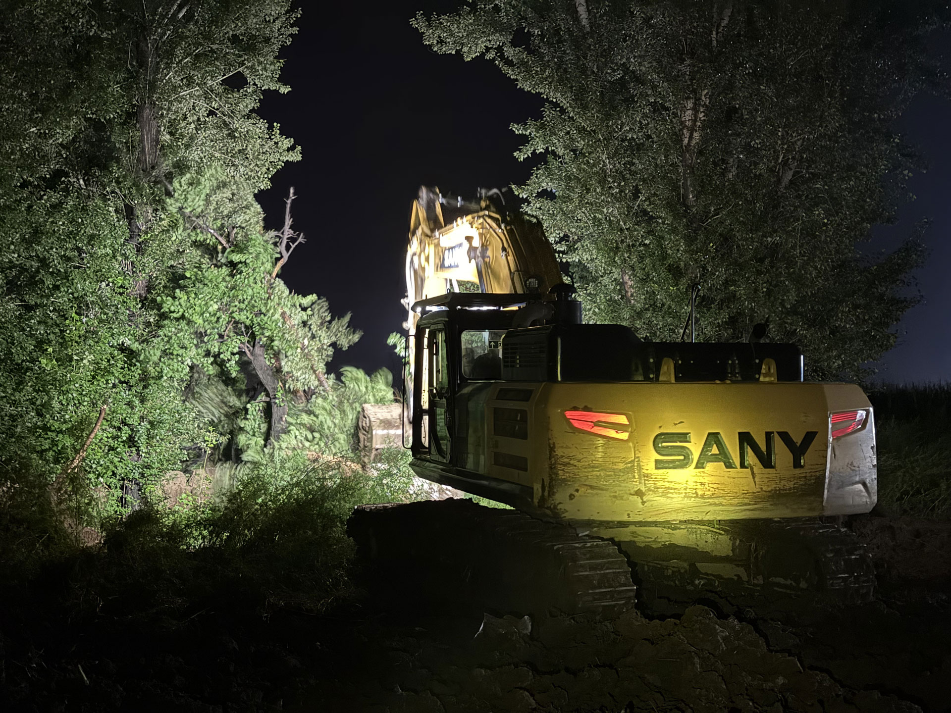 7月29日凌晨,工程机械正在现场河道清淤,保障行洪顺畅。