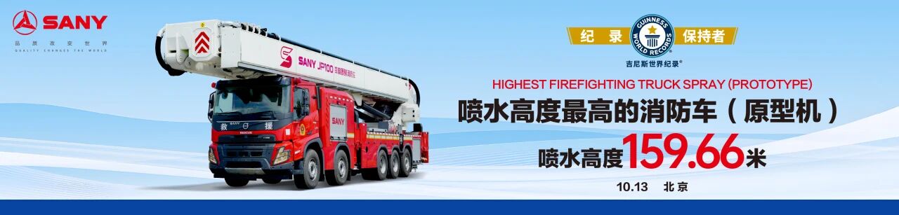 10月13日,在第二十一届中国国际消防设备技术交流展览会现场,中国制造再创辉煌——好体育综合app下载重工自主研发的JP100举高喷射消防车,凭借159.66米的极限喷射高度,成功荣获“喷水高度最高的消防车(原型机)”吉尼斯世界纪录™认证!