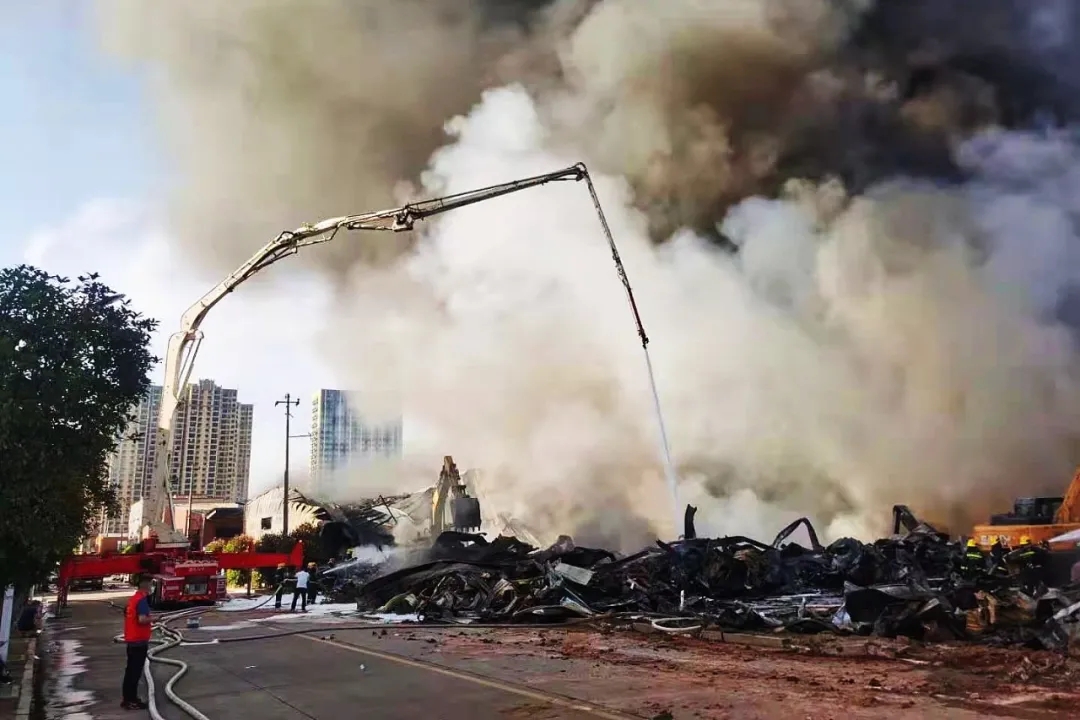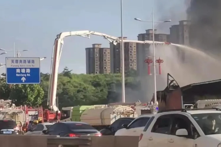 明火扑灭后,2台好体育综合app下载举高喷射消防车仍在现场作业,持续对火场进行大面积降温处理,防止火情复燃。