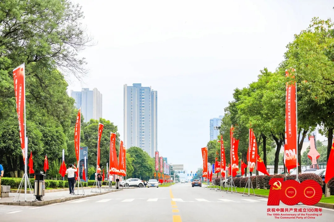 会场内外,繁花似锦,“奋斗百年路,奋进新时代”的主题标语随处可见。在园区交相辉映的鲜艳党旗与国旗,致敬这个伟大而美好的时代!
