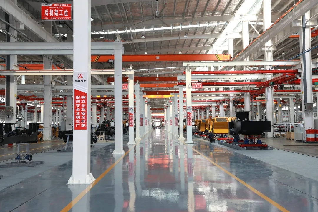 走进路机“灯塔工厂”,左右两条总装线上的产线工人正在有条不紊地组装设备,一条组装平地机,一条组装压路机。